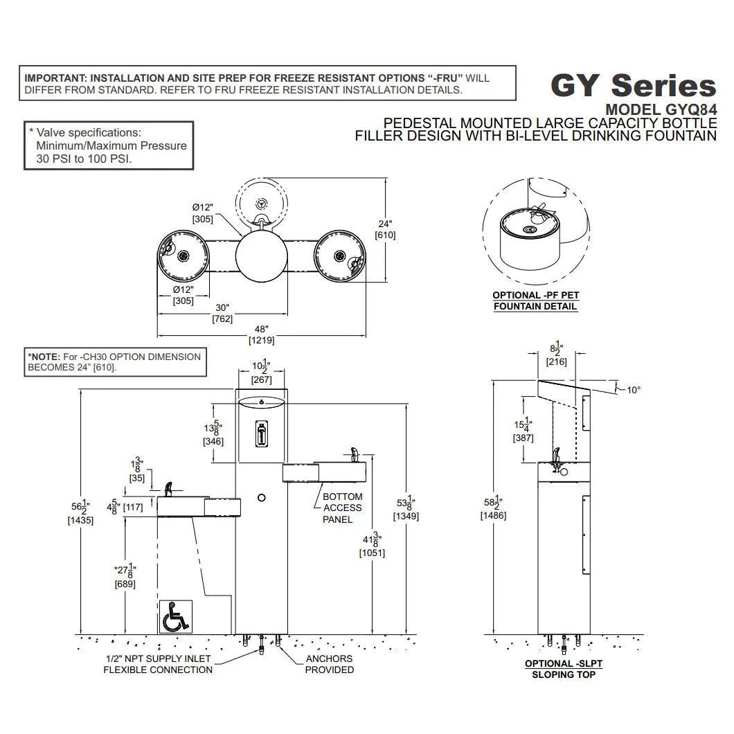 Submittal GYQ84 Series Bottle Filler with Drink Fountains (pdf) GYQ Series Pedestal Mounted Bottle Filler with Bi-Level Drinking Fountains